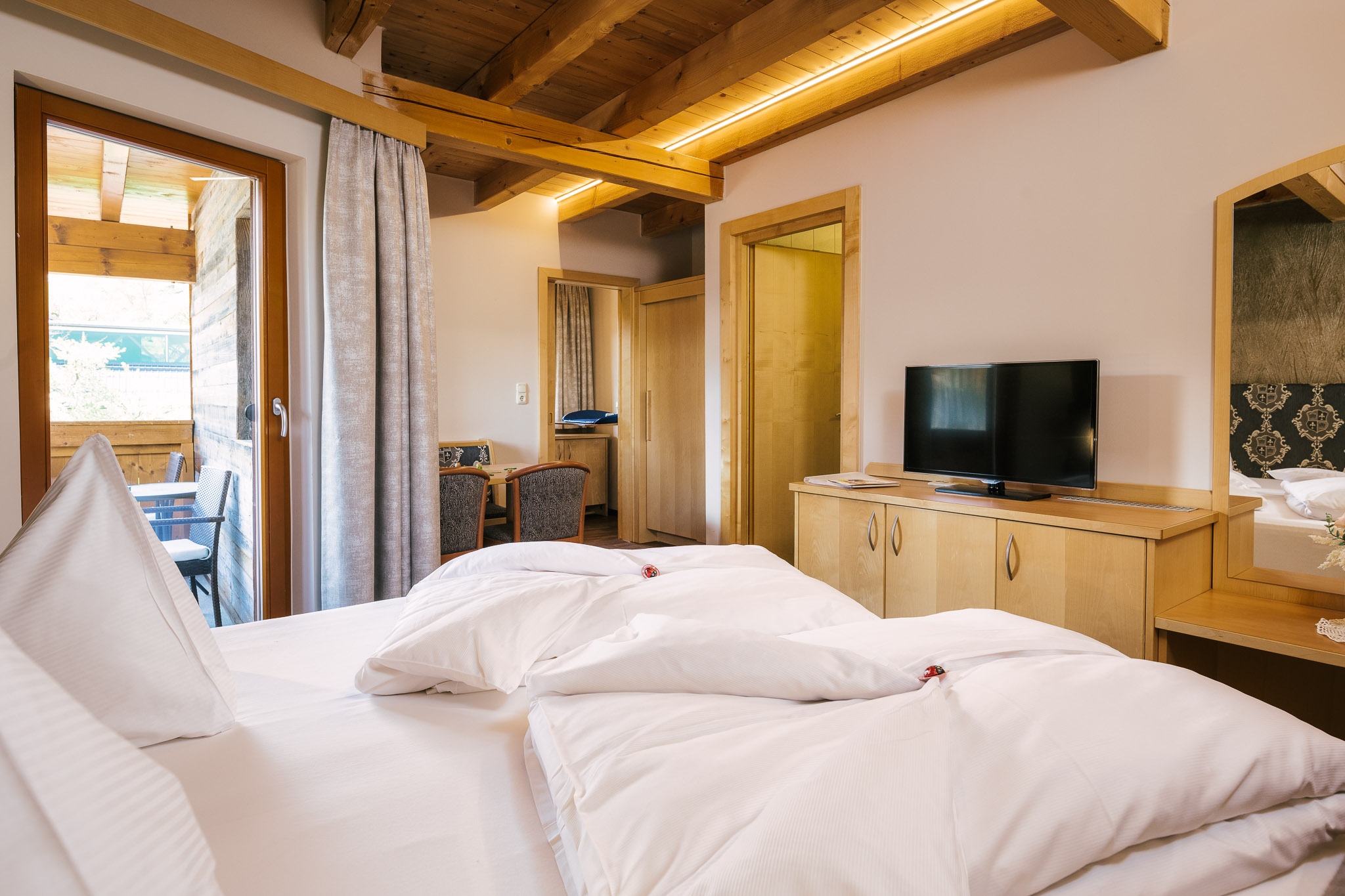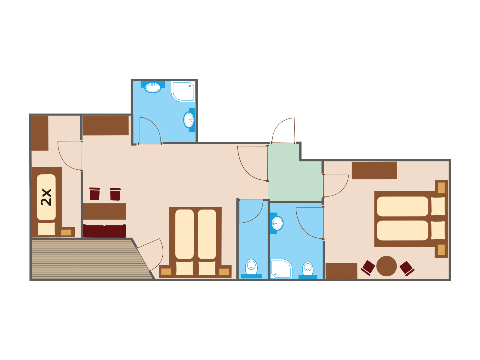 Parents sleeping room, sleeping room with sitting area, kids sleeping room with a bunk bed, equipped with TV, mini fridge, safe, telephone, free W Lan, balcony, 2 x bathroom with shower, 2 x toilette, hairdryer, bag with bath towels.