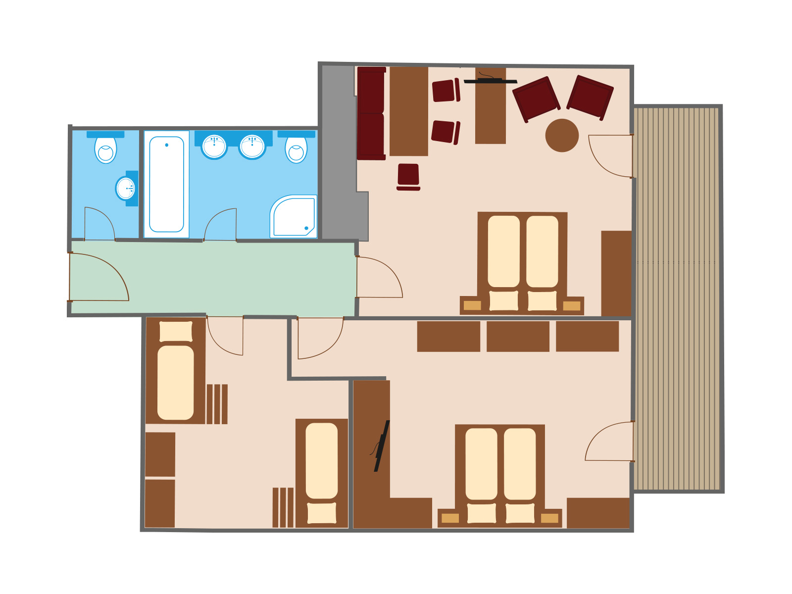 Parents sleeping room, sleeping room with sitting area and tiled stofe, kids sleeping room with a bunk bed and junior bed, equipped with wooden floor, TV, mini fridge, safe, telephone, free W Lan, balcony, bathroom with shower and bathtub, 2 x toilette, hairdryer, bag with bath towels.