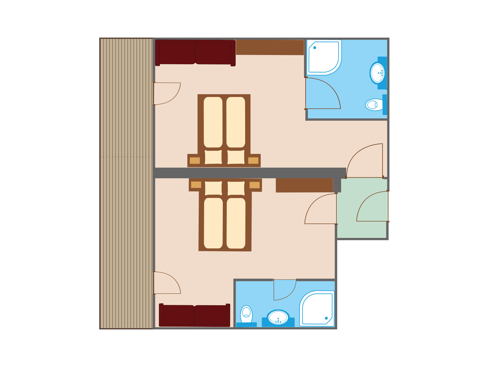 2 x living/ bedroom with sofa bed, equipped with wooden floor, mini fridge, TV, safe, telephone, free W-LAN, 2 x bathroom with shower, hairdryer, bag with bath towels
